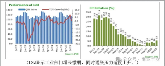 尽管受洪水相关干扰,巴基斯坦经济仍保持复苏态势。工业活动韧性十足,在水泥、汽车及相关领域等大规模制造业反弹的支撑下经济表现持续稳健,出口和侨汇也呈现稳步改善。外部部门保持稳定,2025年9月录得经常账户顺差,强劲的侨汇流入为此提供了支撑。尽管暂时受到食品供应压力的影响,通胀预计仍将控制在目标范围内。国际货币基金组织(IMF)在延长基金设施(EFF)和韧性和可持续性基金(RSF)框架下的成功审查,重申了对巴基斯坦改革路径和审慎宏观经济管理的信心。惠誉、标普和穆迪等全球评级机构的评级上调,反映了投资者信心的恢复。私有化、数字治理以及中巴经济走廊第二阶段(CPEC Phase2.0)合资企业的持续推进,彰显了巴基斯坦政府致力于财政整顿、结构性转型以及实现可持续包容性增长的决心。与此同时,洪水引发的供应中断和临时边境关闭,对部分基本商品价格造成了上行压力。预计2025年10月通胀率将维持在5%-6%的区间内。