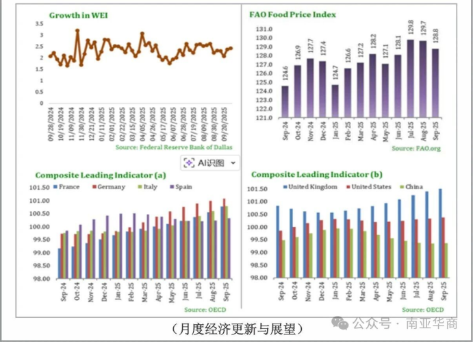 关于全球总体通胀率,WEO预计2025年为4.2%,2026年为3.7%。特别是9月,全球大宗商品市场价格呈现分化趋势。能源价格指数下降0.5%,主要受澳大利亚煤炭价格下跌5.2%的推动,部分被美国天然气价格上涨2.2%所抵消。相反,非能源价格指数因食品价格上涨0.4%和原材料价格上涨0.5%而上涨近1.0%。