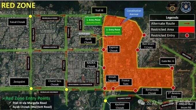(2026年3月2日,伊斯兰堡警方发布红区交通限制示意图。)