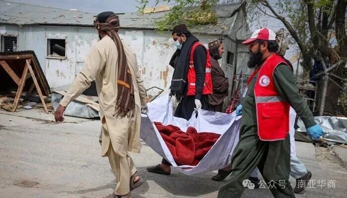(2026年3月17日,在阿富汗喀布尔,红新月会志愿者抬着一名遇难者的遗体。)