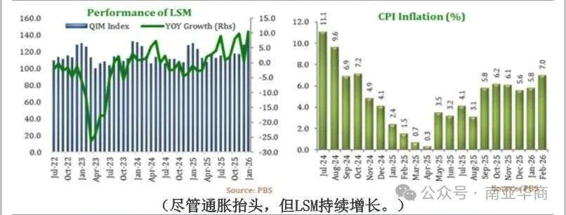 尽管地缘政治风险不断涌现,但巴基斯坦近期的经济前景依然乐观。近期数据显示,工业部门发展势头良好,纺织机械、运输和建筑相关投入品进口增加,有望带动国内工业活动的增长。尽管全球油价上涨和潜在的供应链中断可能会对工业投入成本构成压力,但政府正积极采取审慎措施,包括维持充足的石油储备、管理能源需求以及坚持财政紧缩政策,以保护国内经济。预计2026年3月通胀率将维持在7.5%至8.5%的区间。