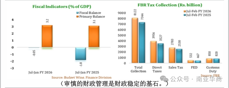 税收方面,基本盈余占GDP的比重维持在3.2%(41516亿卢比),高于去年的3.1%(35187亿卢比)。2026财年7月至2月期间,联邦税务局(FBR)的税收收入增长10.6%,达到81222亿卢比。这一增长主要得益于直接税和间接税,分别增长12.2%和9.1%。在间接税中,销售税、联邦消费税和关税分别增长了10.0%、14.0%和3.8%。