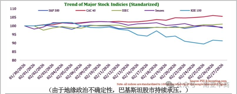 2026年2月,巴基斯坦证券交易所(PSX)的股票市场呈现看跌趋势。KSE-100指数下跌了16,112点,收于168,062.2点,原因是该地区持续的地缘政治紧张局势导致投资者保持谨慎。市值下降了18,973亿卢比,截至2月底降至189,302亿卢比。