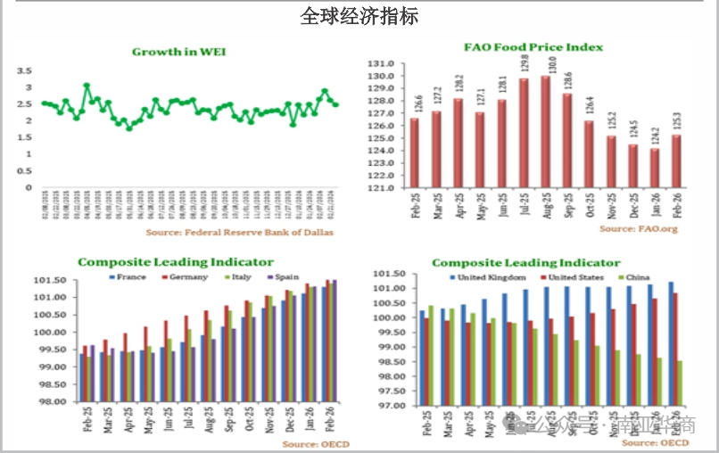 食品和大宗商品市场走势喜忧参半:粮农组织食品价格指数(FFPI)2026年2月平均为125.3点,较1月份修正值上升1.1点。这是该指数在连续五个月下降后首次出现上涨。指数回升主要原因是谷物、肉类和植物油价格指数的上涨,这些涨幅超过了乳制品和糖类价格指数的下跌。与历史水平相比,当前FFPI同比下降1.3点,较2022年3月的峰值下降了34.9点。此外,大宗商品指数显示,能源和非能源价格指数分别小幅下降0.5%和1.2%。具体而言,饮料价格大幅下降15.6%,金属价格下降1.7%。而食品价格上涨2.1%,原材料上涨1.5%,化肥上涨6.5%,贵金属上涨1.7%。