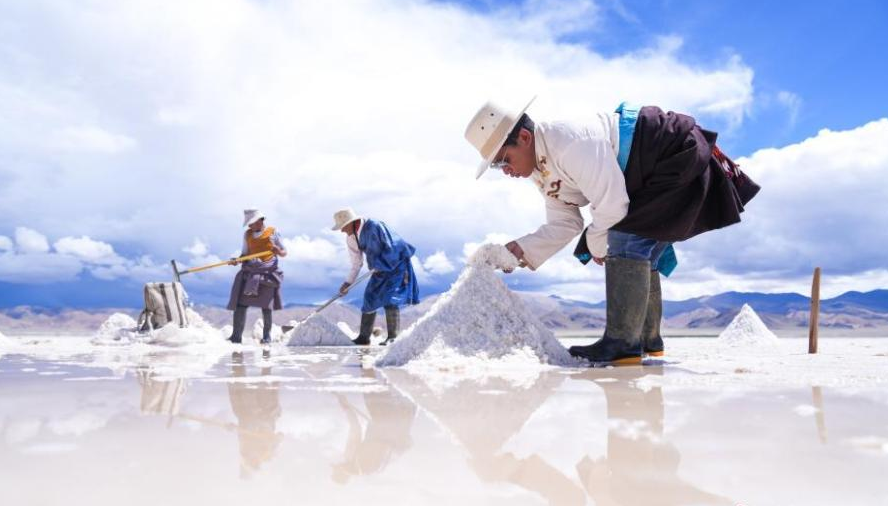 People collect crude salt in a salt lake in Yanhu Township, Geji County, Ali Prefecture, Xizang Autonomous Region, July 20, 2025. (CNS)