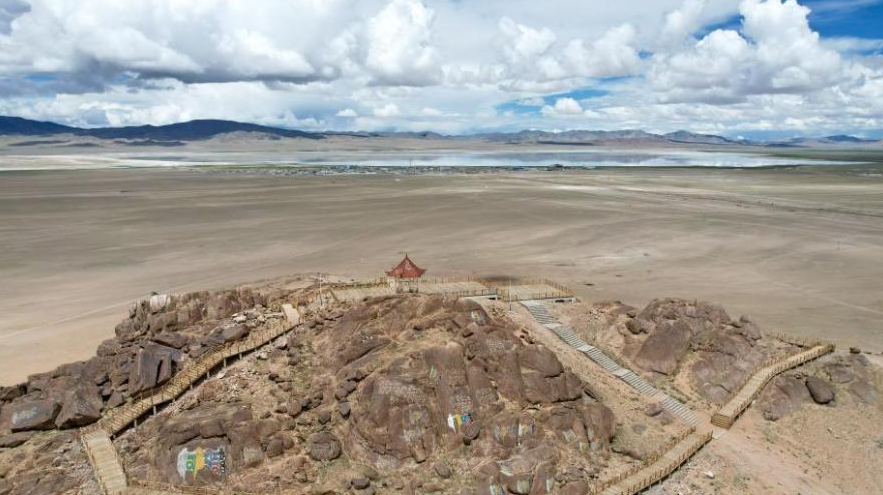 Aerial photo taken on July 20, 2025 shows the rock painting ruins park in Yanhu Township, Geji County, Ali Prefecture, Xizang Autonomous Region. (CNS)