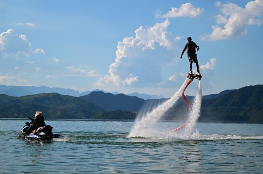 A visitor enjoys a water activity at a water sports center in Huangshan City, east China's Anhui Province, Aug. 28, 2025. (Xinhua)