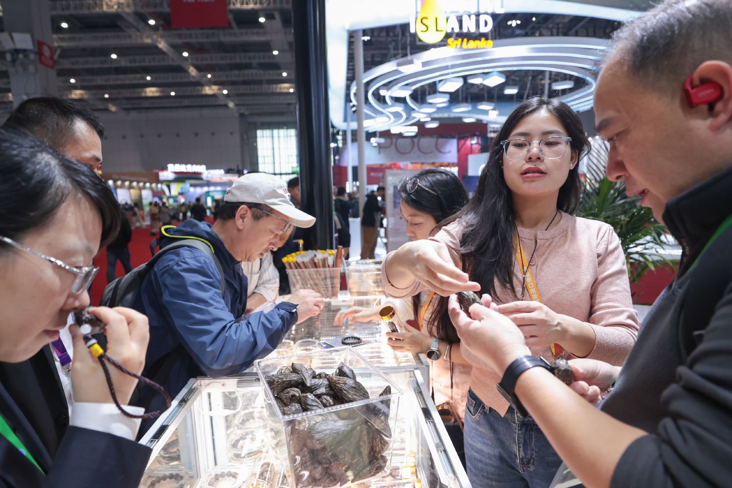 On Nov 9, 2025, the 8th China International Import Expo was held in Shanghai, and visitors were shopping for agarwood toys at the Vietnamese booth.(CNS)