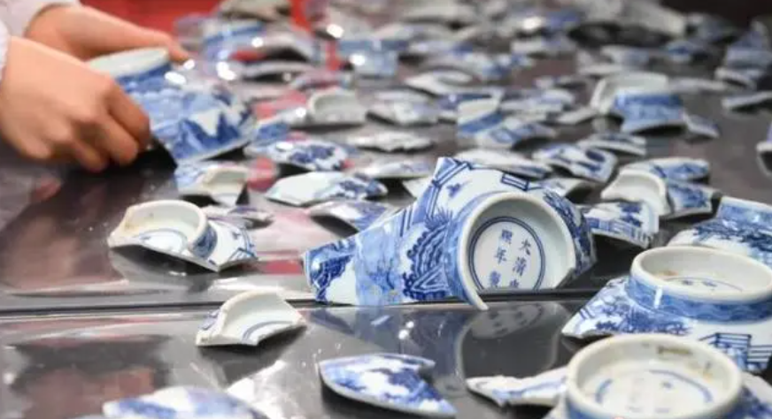 工作人员从圆明园内发掘出的瓷器碎片中挑选合适的部分进行拼接修复。(图/中新网)