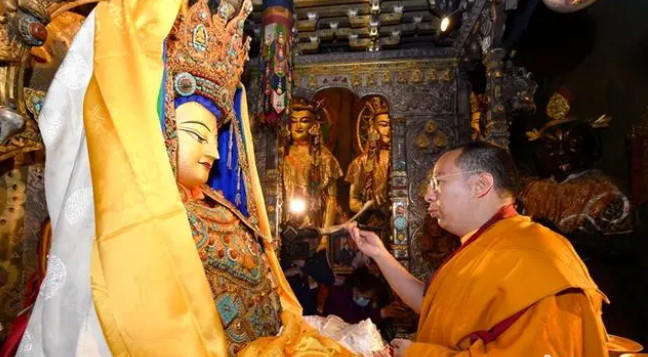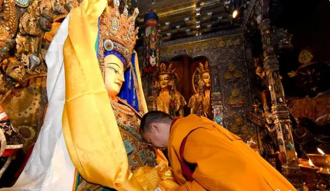 大昭寺主殿内供奉有唐代文成公主带入雪域高原的释迦牟尼12岁等身像,如今为藏传佛教各教派所尊崇。班禅一边朝拜,一边与僧众齐声念诵《释迦牟尼佛赞》,并向佛像敬献哈达。