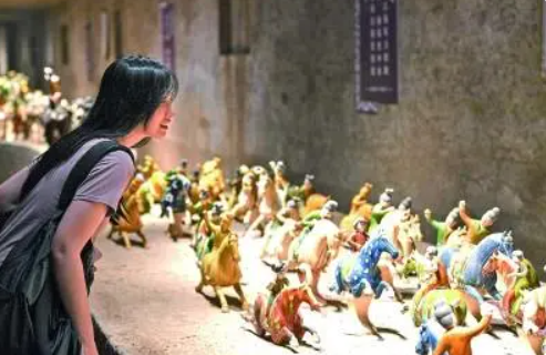 游客在河南洛阳朝阳镇南石山村的唐三彩作品陈列展示馆内参观。(图/新华社)