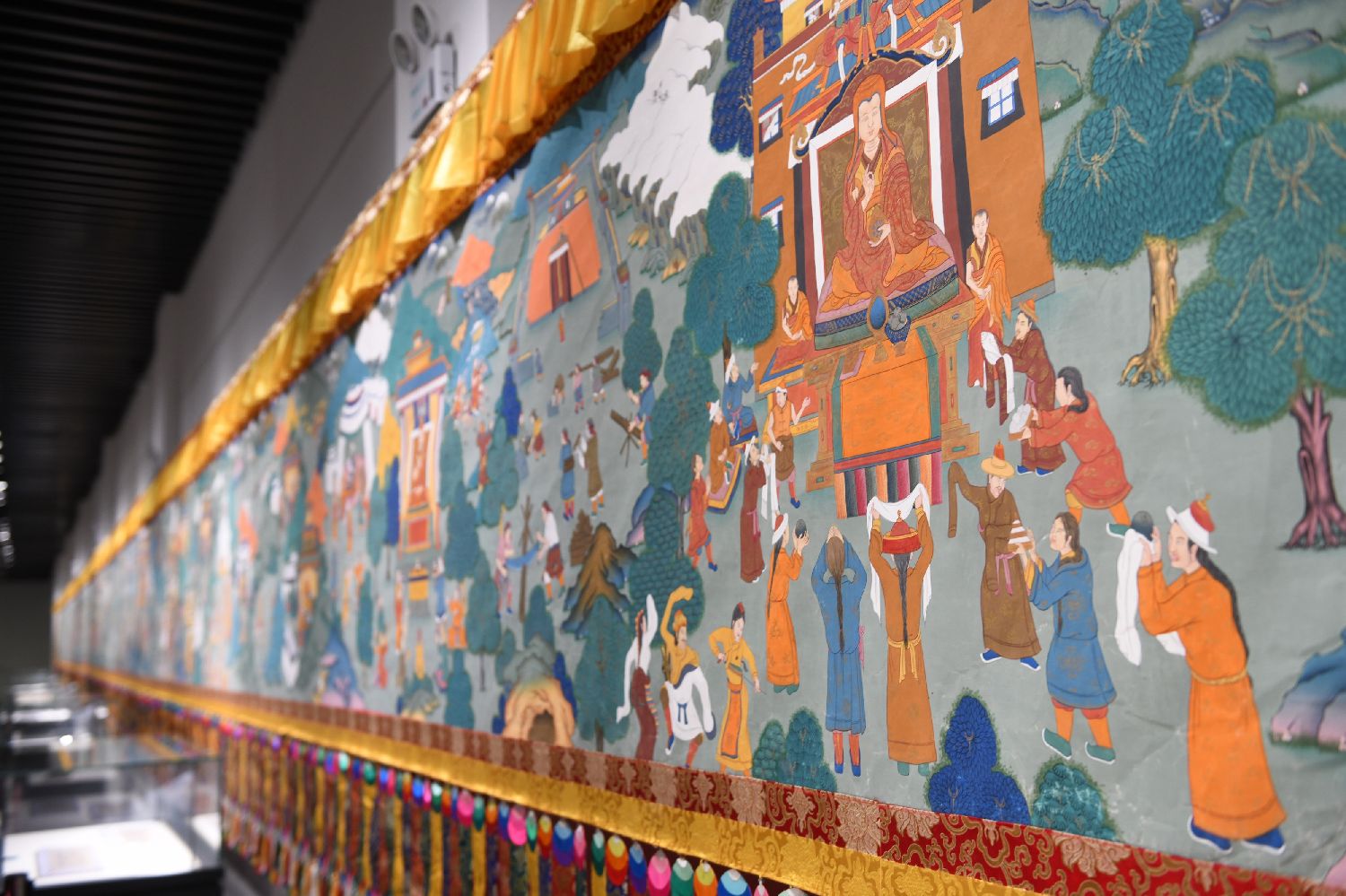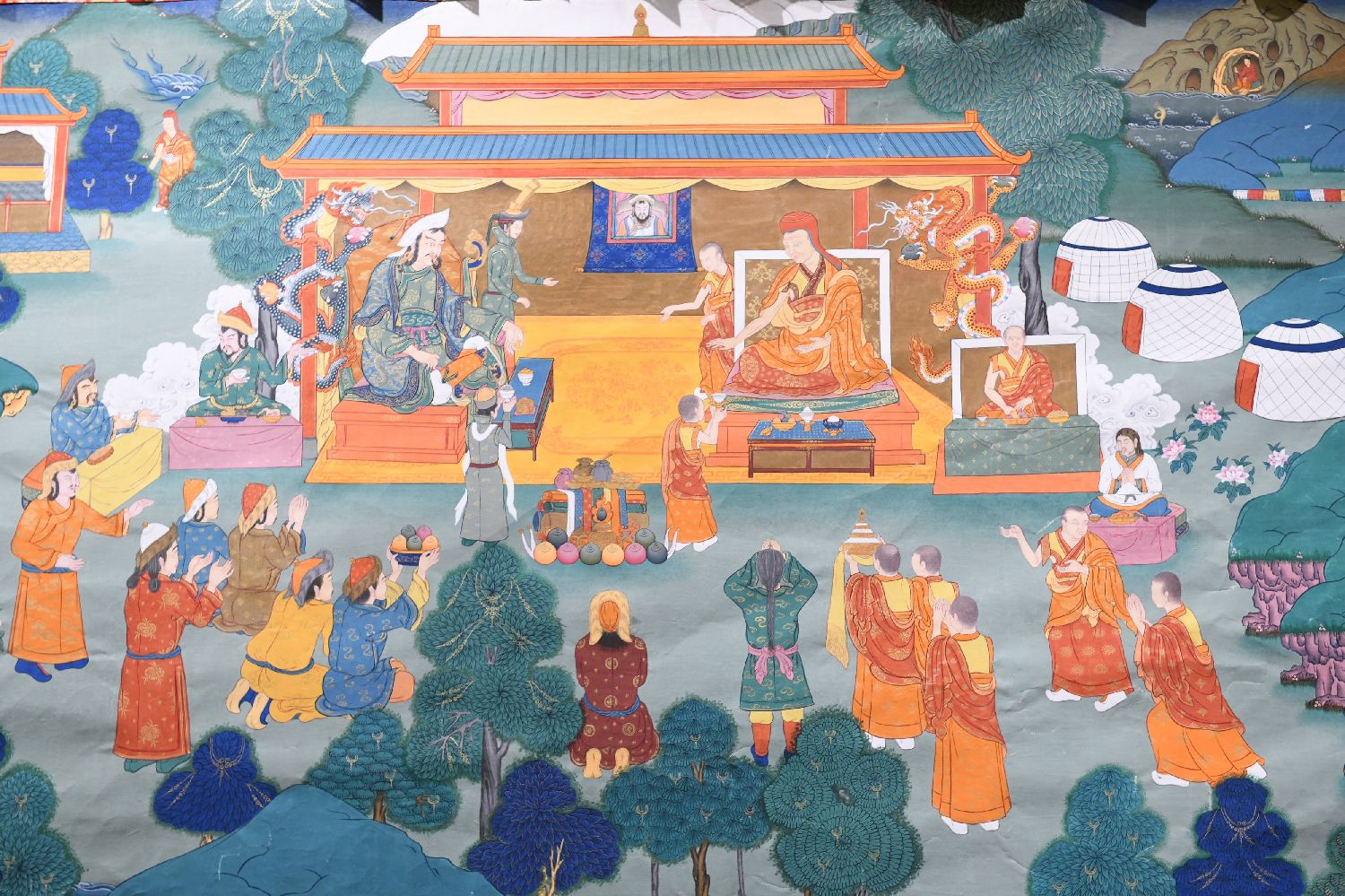 图为8月20日,在兰州市博物馆展出的大型历史题材卷轴唐卡“凉州会盟”。(图/中新社)