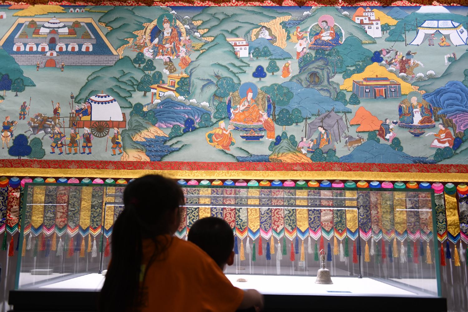 图为8月20日,两名小观众参观大型历史题材卷轴唐卡“凉州会盟”。(图/中新社)