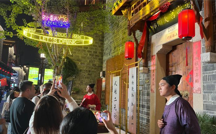 “在历史上涌现了很多文人名士、国之栋梁与商贾奇才,但有些对其知之甚少,这种互动演出可以让我更好了解历史,在和他们的互动中,仿佛我真的在和历史人物对话。”来自湖北的游客黄玲玲表示,自己专门在汉服租赁店租了一套汉服游览景区,让自己与这些历史建筑更好“融为一体”。