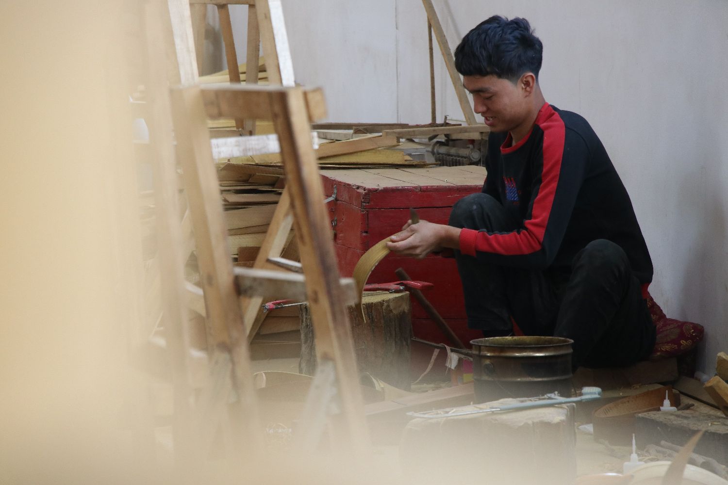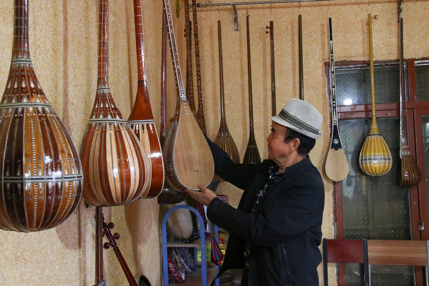 走进他家里,看到前院里挂满了各类手工乐器,儿子和儿媳正在相互配合着给乐器上弦,最后的调音工作由经验丰富的努尔冬·司马义完成,保证每一把琴同音共律。后院不时传来制作乐器的电锯声,几位徒弟分工明确,正在加工乐器的不同配件。
