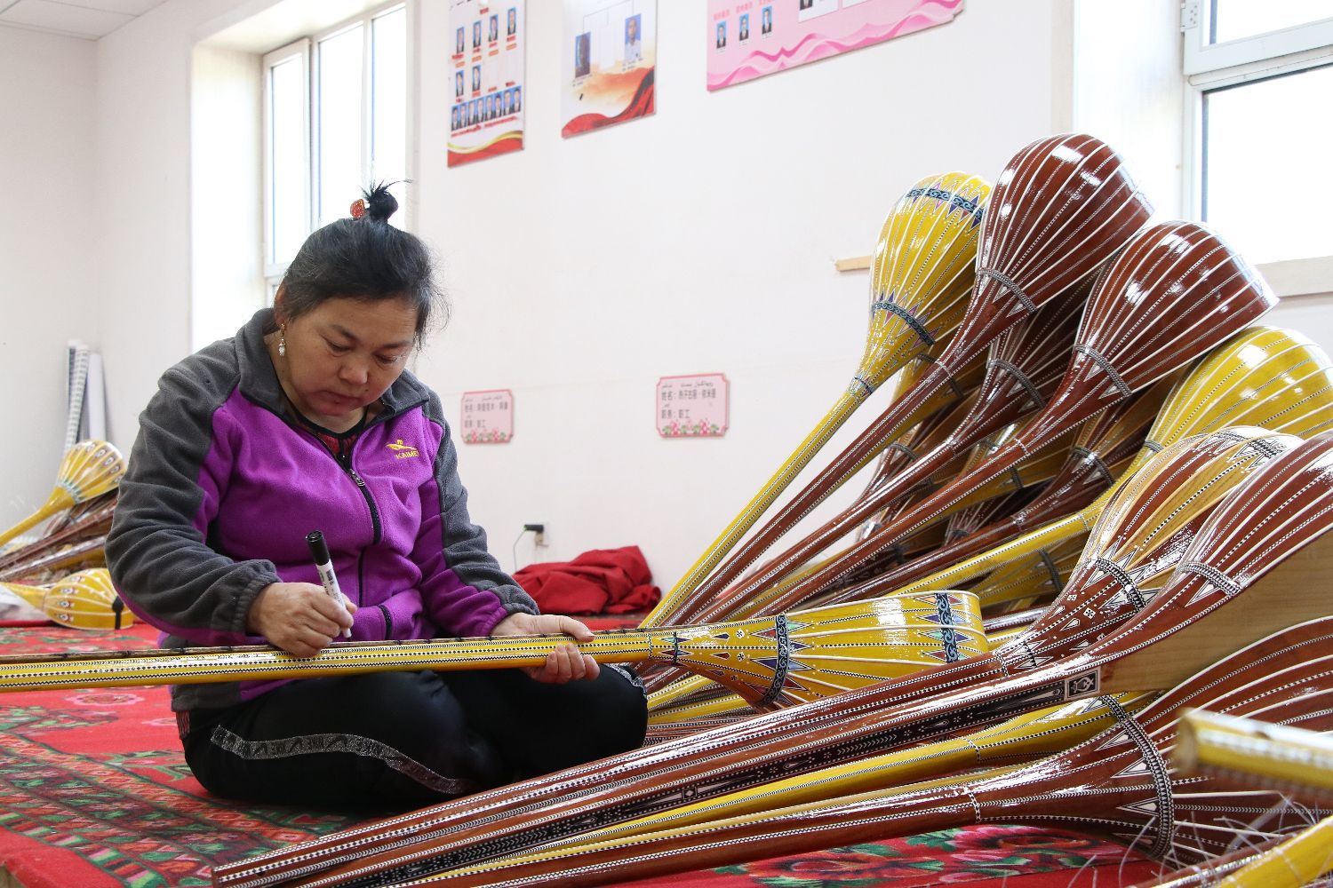 近日,在阿克苏地区新和县依其艾日克镇加依村乐器产业园内,工人们分工明确,忙碌地生产乐器的各个配件。(图/中新社)