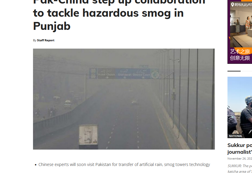 《今日巴基斯坦》26日报道,其中一个合作领域是在受雾霾影响的地区进行人工降雨。
