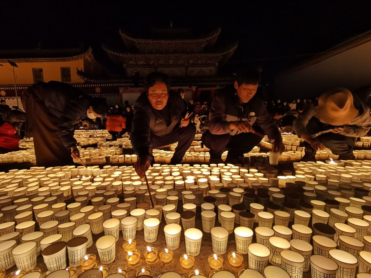 图为12月7日,信众在青海隆务寺内燃灯。(图/中新社)