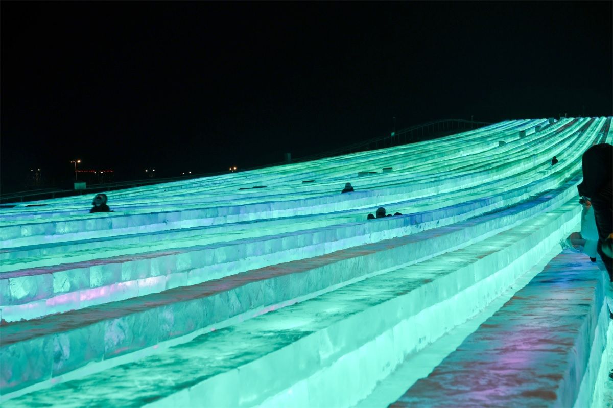 12月17日,第二十五届哈尔滨冰雪大世界迎来首批游客。全新升级的超级冰滑梯亮相,滑道最长521米。(图/中新社)