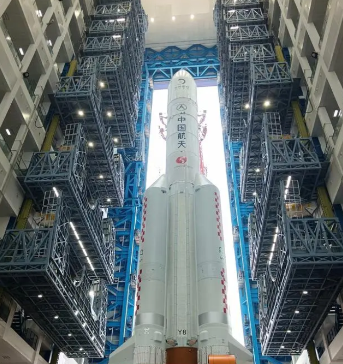 4月27日,嫦娥六号探测器和长征五号遥八运载火箭器箭组合体开始转运。(图/新华社)