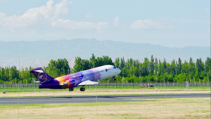 6月6日,中国支线客机ARJ21首架客改货飞机开展首次商业飞行,也是首次飞出国门,图为该飞机从新疆伊宁机场起飞。(图/中新社)