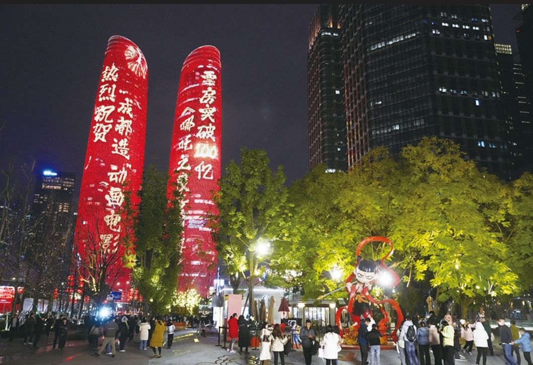 13日,民众在位于四川成都交子大道的哪吒雕塑前拍照留念。当晚,成都天府双子塔亮灯,庆祝《哪吒2》票房破“百亿”。(图/中新社)