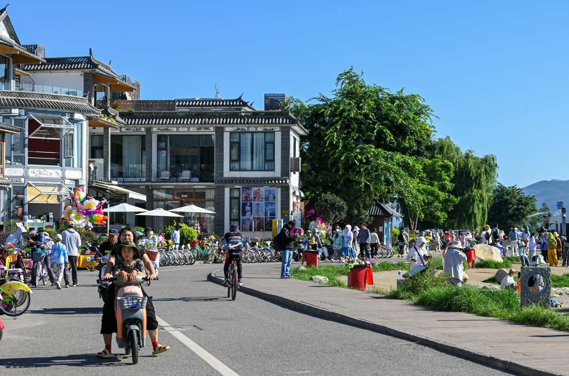 8月1日,游客骑车游览云南大理洱海生态廊道。(图/中新社)