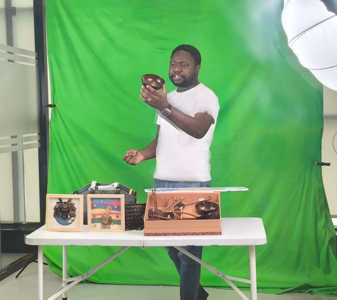 “这是椰雕碗,用海南老椰子壳手工制作,每一个都独一无二”“再看这个黎锦时尚挎包,背在身上就是行走的艺术品”……海南海口复兴城互联网信息产业园的直播间里,来自加纳的主播乌斯曼(Usman)正通过TikTok,用英语向海外网民推销海南文创产品。