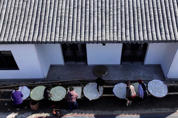 1月8日,在蔡家桥镇朱旺村,村民晾晒加工好的年糕。(图/中新社)