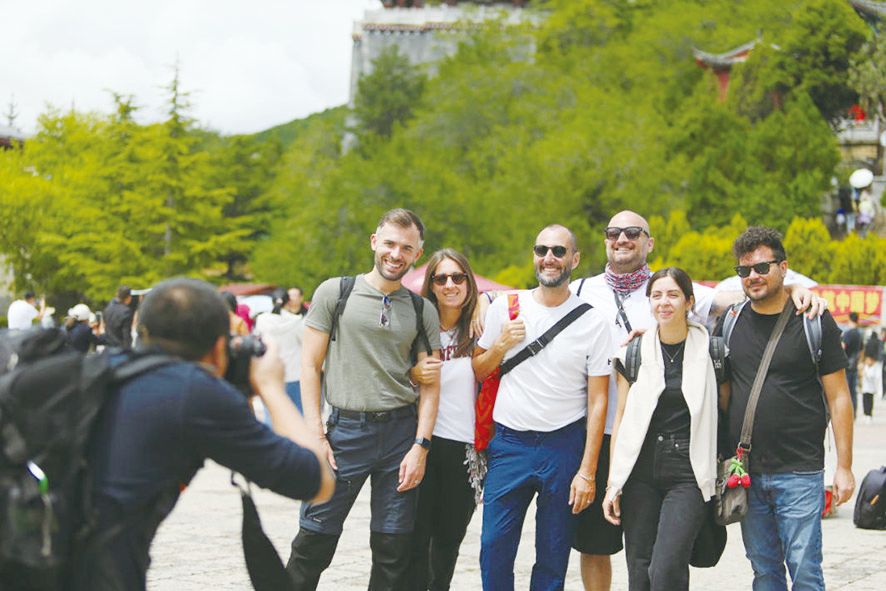 地处云南省西北部的迪庆藏族自治州香格里拉市,吸引各地游客前去观光纳凉。图为,此前意大利游客打卡月光广场。(图/中新社)