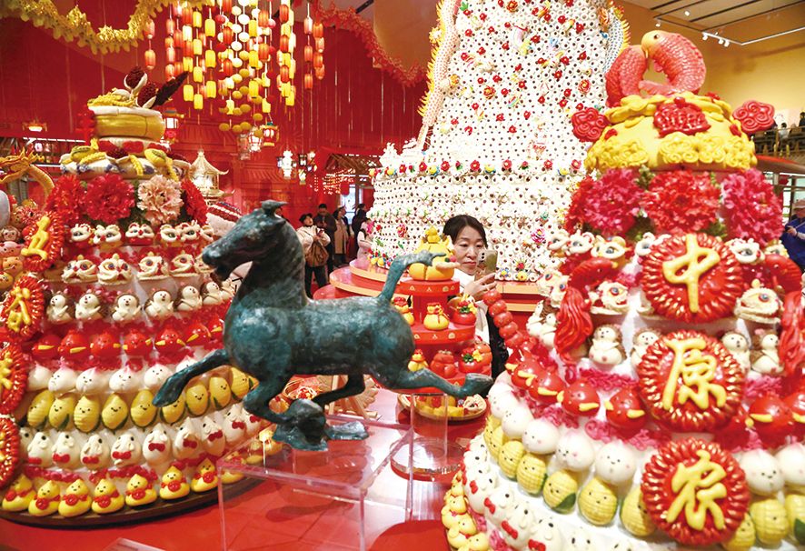 “食为天”展区中,一座高4.5米、直径3.6米的花馍“大鼓枣山”极为醒目。澄城面花是陕西省非遗代表性项目,俗称花馍。这件花馍作品来自陕西省澄城县红云花馍农民合作社,以“天圆地方”为理念,融入花卉、生肖等丰富元素。