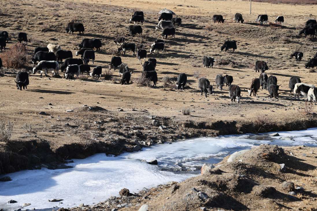 资料图为2025年12月24日,四川省甘孜州塔公镇江巴村成群牦牛觅食,一旁河水结成冰。(图/中新社)
