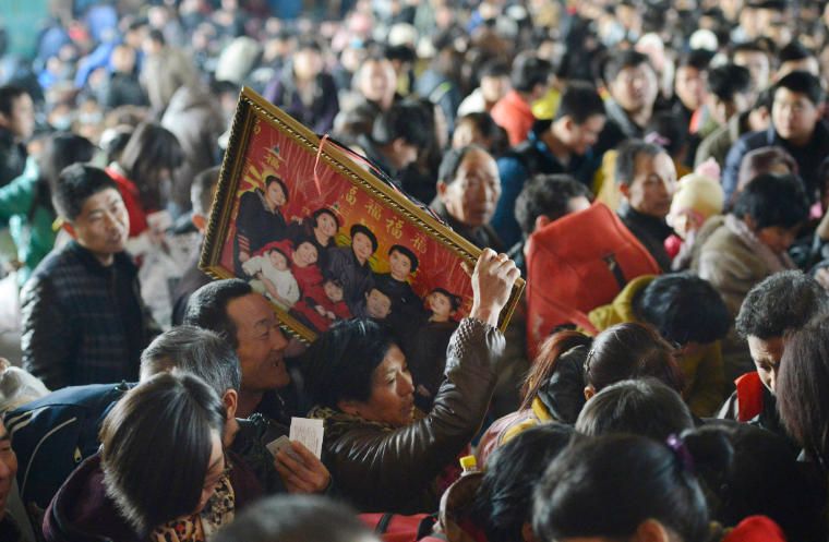 资料图为2014年1月14日,山西太原火车站候车大厅内,四川籍农民工赵虎与妻子仕珍带着全家福照片返乡。(图/中新社)