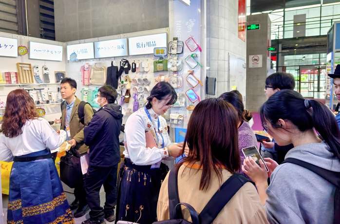 华交会展台前身穿“马面裙”的工作人员正在向采购商介绍产品。(图/上海上观新闻)