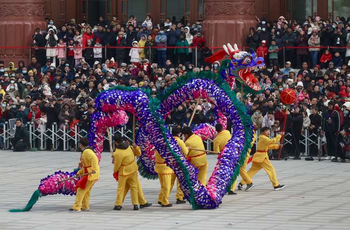 3月1日,“非遗贺新春民俗闹红火”宣传展示活动在北京举行。图为曲周龙灯展演。(图/中新社)