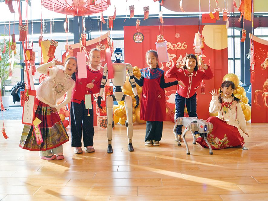 吉林长春南湖实验中海小学将传统文化与科技创意相融合,迎接学生返校。图为学生们和机器人、机器狗合影。(图/中新社)