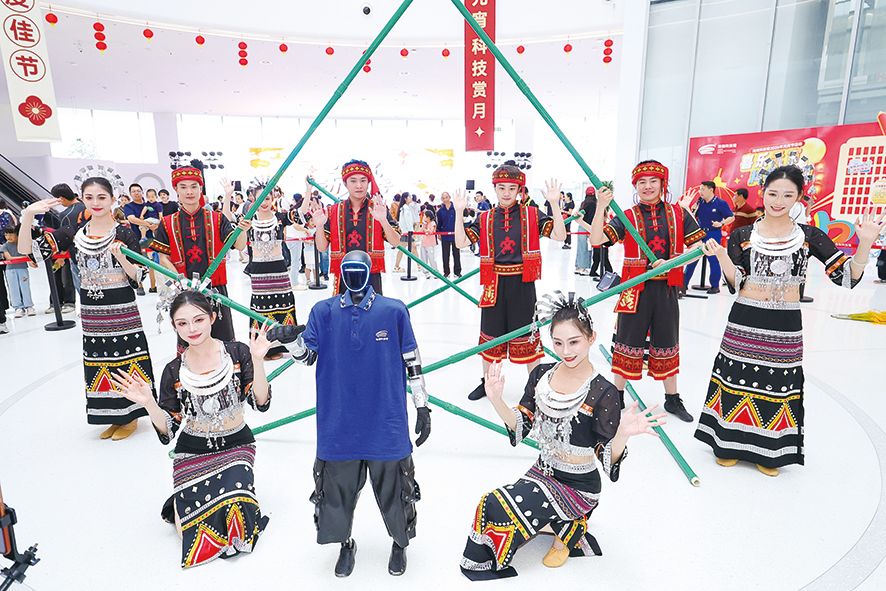 海南科技馆近日上演“竹竿舞·人机共舞”特色表演,专业舞者与智能机器人默契配合,传统民俗与现代科技交融,为民众送上了一场兼具文化味与科技感的视觉盛宴。(图/中新社)