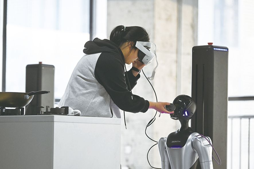 安徽合肥零次方机器人数据采集中心,身为“老师”的机器人数据采集员带领机器人“学生”进行场景实操训练。图为机器人训练师连接人形机器人。(图/中新社)
