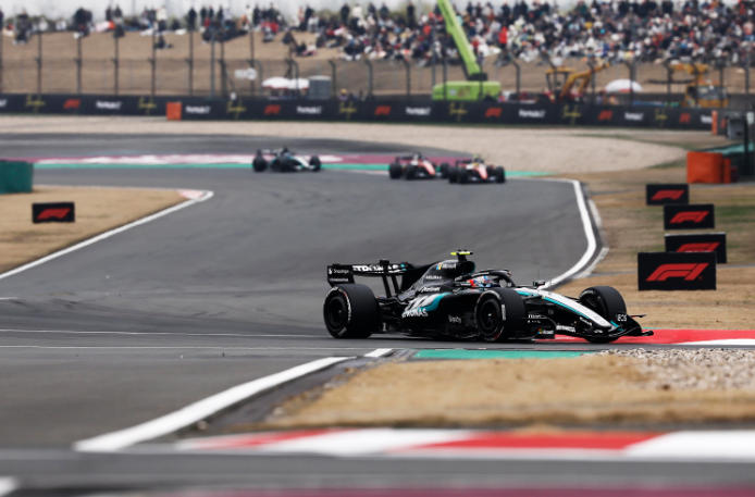 3月15日,2026F1中国大奖赛正赛在上海国际赛车场举行,梅赛德斯车队的19岁车手安东内利获得冠军。图为安东内利(前)驾驶赛车在比赛中。(图/中新社)