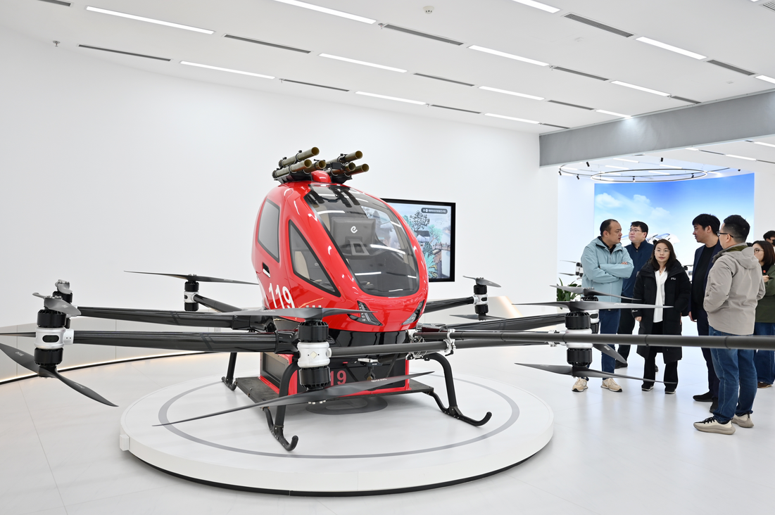 图为亿航智能的无人驾驶消防航空器EH216-F吸引参观者。(图/中新社)