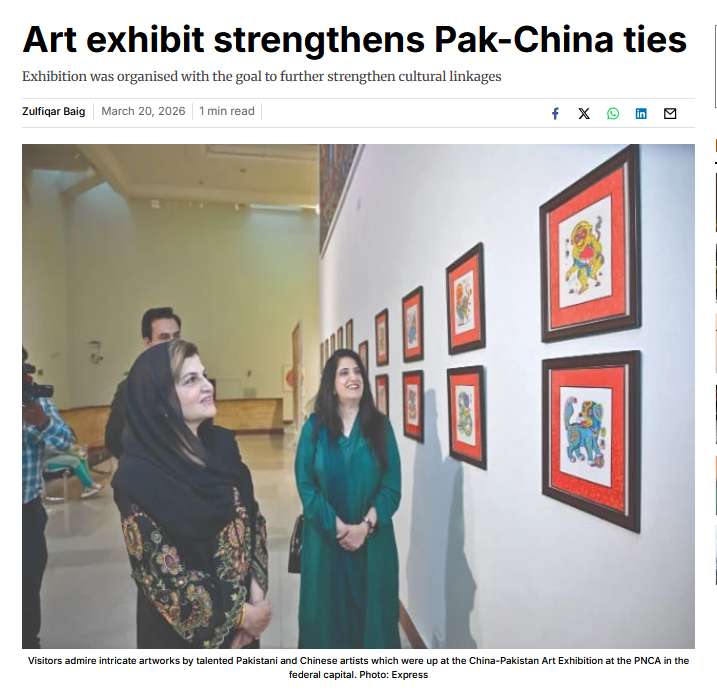 《论坛快报》20日报道,据悉,本次展览展出了巴基斯坦与中国知名艺术家的作品,获得巴中两国观众的高度赞誉与赞赏。