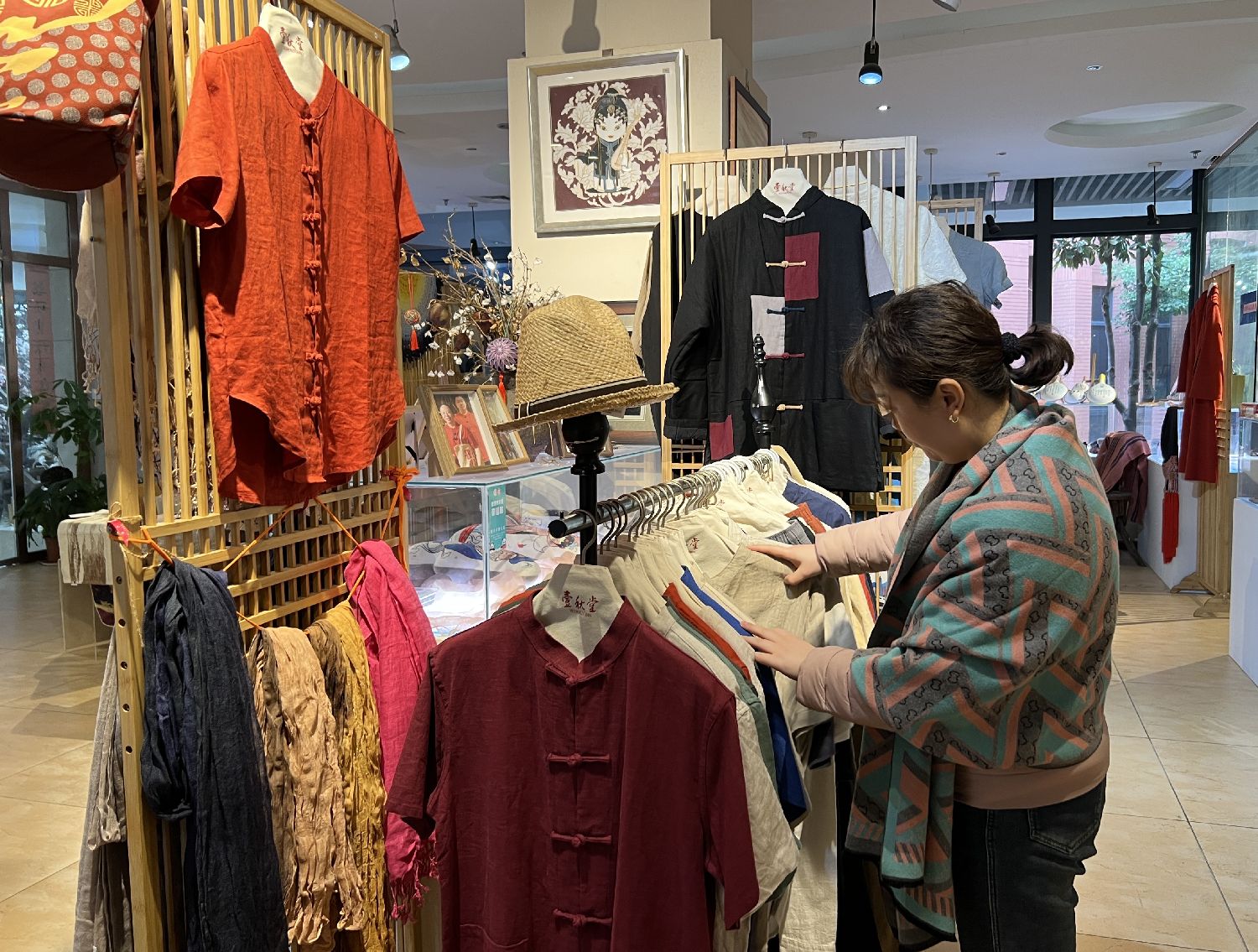 2月5日,重庆市民在“壹秋堂”非遗工坊内挑选夏布产品。(图/中新社)