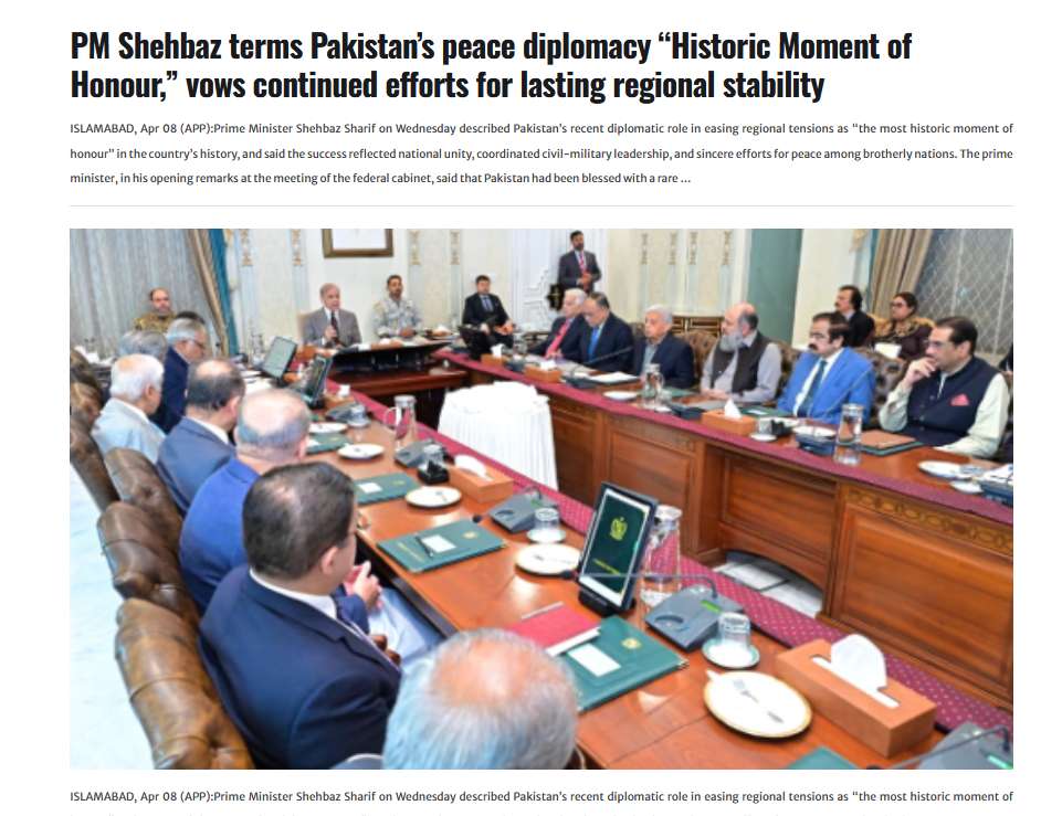 8日,夏巴兹在联邦内阁会议中称,巴基斯坦近期为缓和地区紧张发挥的外交作用,是巴国历史上“最具历史性的荣耀时刻”。(图/巴通社网站截图)