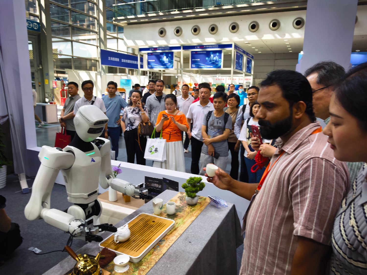 开展首日,具身机器人成为展会亮点,宇树机器人、众擎机器人、智元机器人等企业展台前围满了观众,能够爬坡过坎、沏茶递茶、演奏音乐的机器人令人目不暇接。