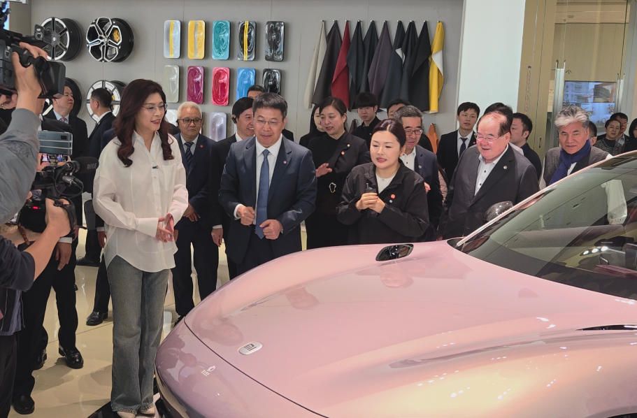 4月12日,中国国民党主席郑丽文(左一)一行在北京参观小米汽车工厂。(图/中新社)