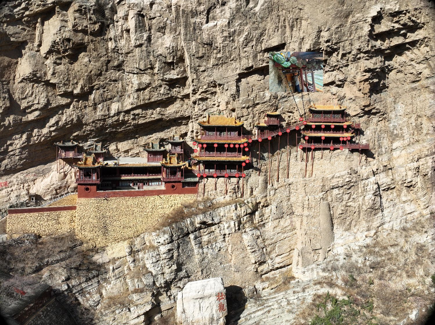 悬空寺位于山西省大同市恒山金龙峡西侧翠屏峰峭壁间,始建于北魏太和十五年(公元491年)。其建筑以半插飞梁为基,借助岩石暗托,让梁柱上下浑然一体,是世界上现存建在悬崖绝壁上最早的木结构建筑群。1982年,悬空寺被列入中国重点文物保护单位。