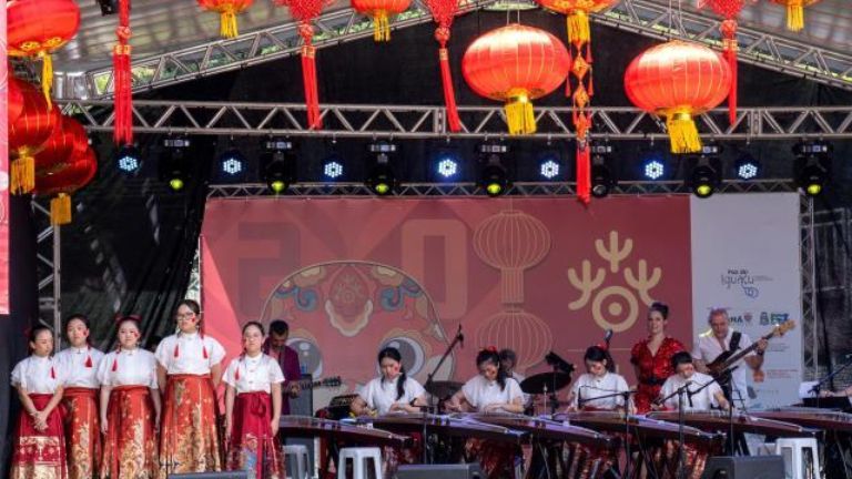 当天,伊瓜苏和平广场上人头攒动,旅巴华人国乐团的小演员们抚琵琶、奏古筝,巴西乐团吉他贝斯齐奏,歌手纵情歌唱,巴西伊瓜苏少林武校一招一式,虎虎生威。