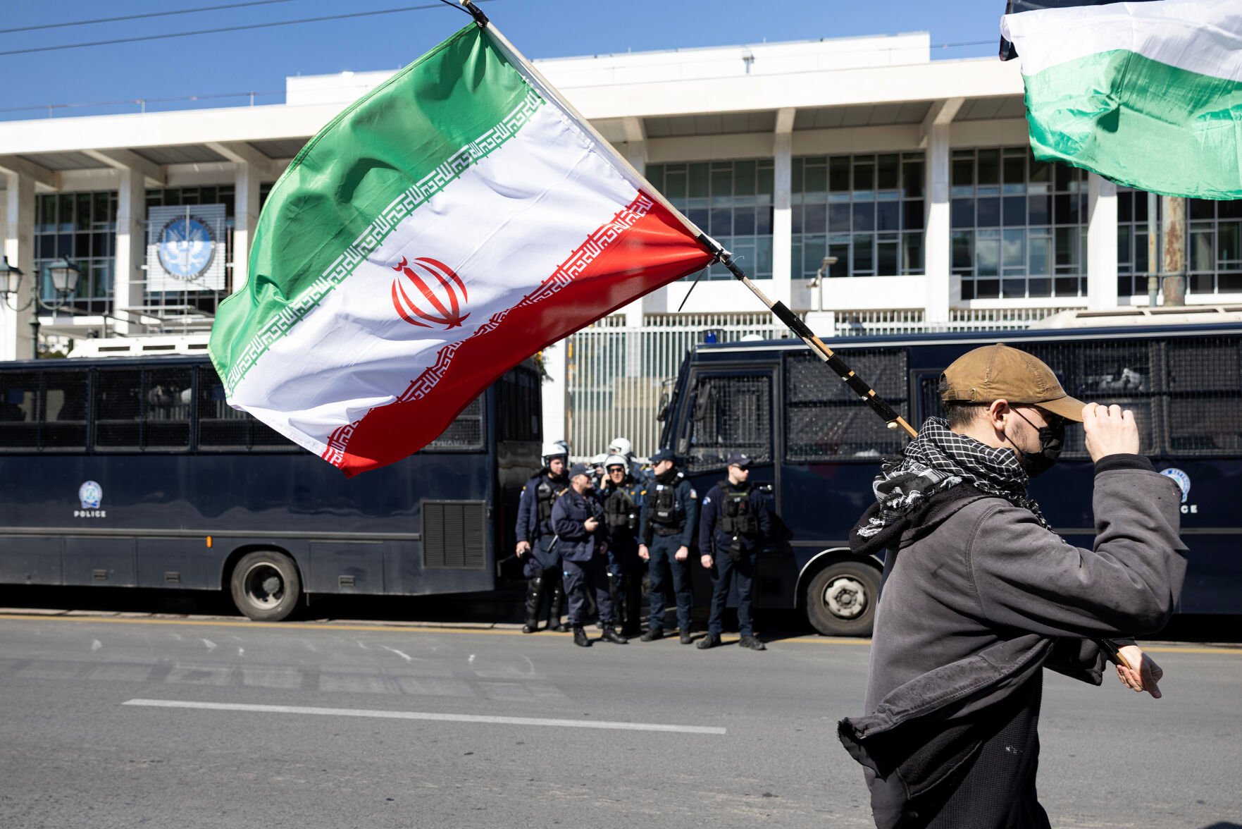 在希腊雅典的美国和以色列大使馆前,逾千名示威者手持伊朗国旗或标语牌、高喊口号参与游行示威活动,抗议美以对伊朗发动袭击。为维护现场秩序,当地出动大量警力并在美国和以色列大使馆前使用一排警用大巴封锁隔离。