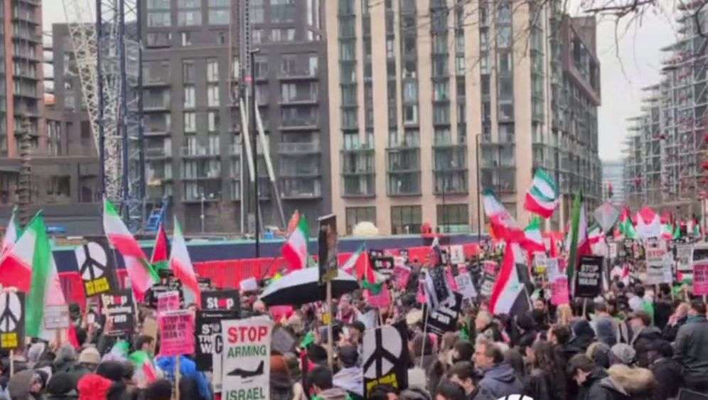 据报道,此次示威活动由核裁军运动(CND)、“停止战争联盟”及巴勒斯坦团结运动(PSC)等多个团体联合发起。游行现场随处可见伊朗国旗,示威者高举“停止对伊朗战争”“停止武装以色列”“不对伊朗发动战争”等标语,呼吁立即停火止战。