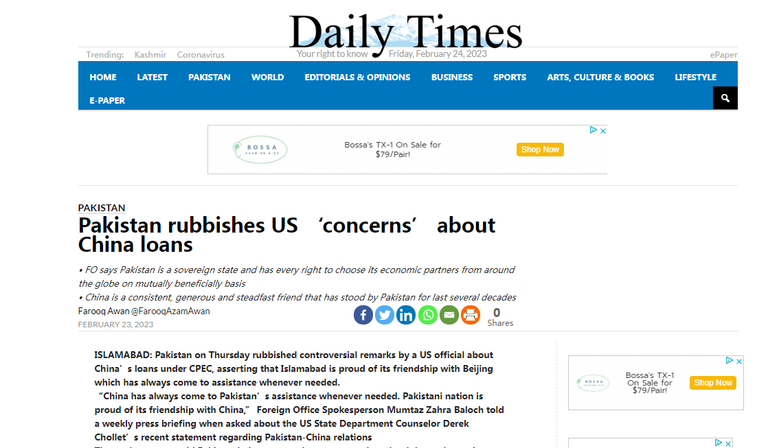 巴基斯坦批驳美方关于中国放贷“争议”言论。(图/巴基斯坦《每日时报》网站截图)